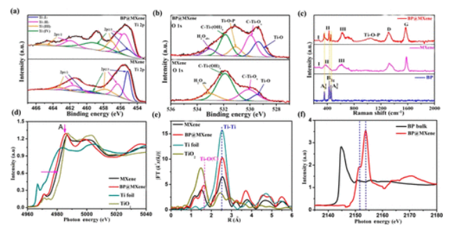 Figure 3.異質結構BP@MXene 復合材料的表征。 BP@MXene 復合材料和 MXene的(a)Ti 2p和(b) P 2p 的高分辨率 XPS 光譜。(c) BP@MXene 復合材料、MXene和BP的拉曼光譜。(d) Ti K-edge的歸一化XANES 光譜。(e) BP@MXene 復合材料、MXene、Ti箔和TiO2的EXAFS數(shù)據(jù)在Ti K-edge XANES光譜上的相應k3加權傅立葉變換曲線。 (f) P K-edge的歸一化XANES光譜。