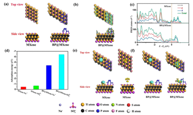 Figure 4. DFT計算結果。(a)用于描繪MXene和BP@MXene 復合材料的模型的頂視圖和側視圖。黃色、黑色、紫色和藍色的原子分別代表 Ti、C、O和P。(b)計算出的MXene和BP@MXene 復合材料之間的電荷密度差異。等值是0.01以更好地繪制差異。(c)計算出MXene和BP@MXene 復合材料的PDOS,費米能級對齊。(d) 計算MXene和BP@MXene 復合材料上最穩(wěn)定的Na和SO