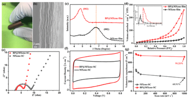 Figure 5. BP@MXene薄膜的表征和BP@MXene 薄膜電極的電化學表征。(a)具有高柔韌性的獨立式BP@MXene薄膜的數(shù)碼照片。(b)層狀BP@MXene多孔結構的橫截面SEM圖。(c) MXene和BP@MXene薄膜的XRD 圖。(d)MXene和 BP@MXene 薄膜的N