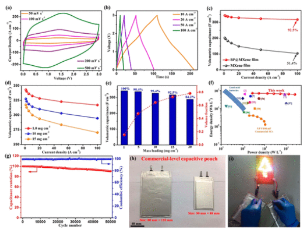-2)與報告值和最先進的ESD(商業(yè)SC和鉛酸電池)的Ragone圖。應該注意的是,所有呈現(xiàn)的能量和功率密度值都按整個設備的總體積進行歸一化,而不僅僅是電極。 (g) BP@MXene-SC在50 A cm