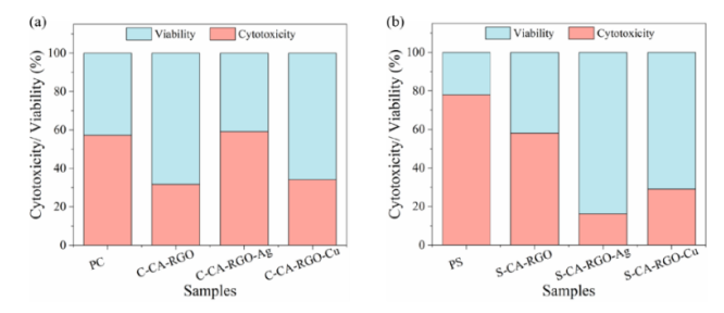 圖 8. HEK293細(xì)胞暴露于RGO和NPs修飾的 (a) 棉織物和 (b) 絲織物時(shí)的細(xì)胞毒性和活力。