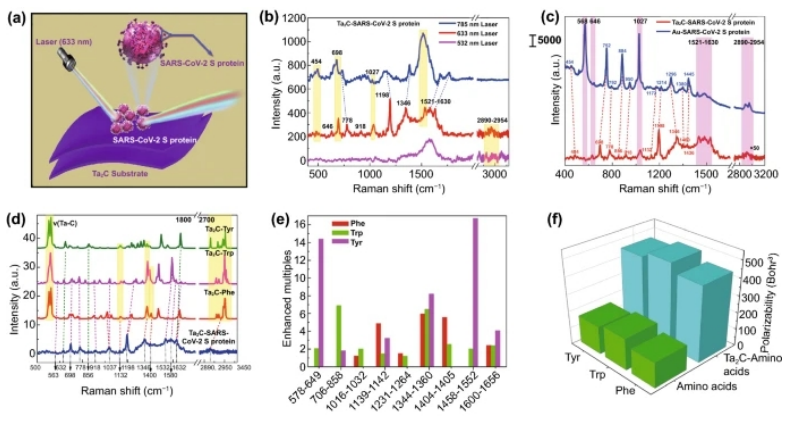 Figure 6. (a) 633 nm激發(fā)激光下SARS-CoV-2 S蛋白的Ta?C NSs拉曼散射圖。(b)10?? M SARS-CoV-2 S蛋白在532 nm、633 nm和785 nm不同激光波長激發(fā)下的Ta?C NSs底物的拉曼光譜。(c) Phe、Trp、Tyr氨基酸分子及其對(duì)應(yīng)的Ta?C-氨基酸分子復(fù)合物的靜態(tài)拉曼光譜,以及SARS-CoV-2 S蛋白在Ta?C NSs上的實(shí)驗(yàn)拉曼光譜。(d) SARS-CoV-2 S蛋白在Ta?C NSs和Au NPS底物上的拉曼光譜。(e)九種計(jì)算的拉曼模型中Ta?C -氨基酸分子復(fù)合物的拉曼增強(qiáng)倍數(shù)。(f) Phe、Trp、Tyr等氨基酸分子及其對(duì)應(yīng)的Ta?C-氨基酸分子配合物的計(jì)算極化率。