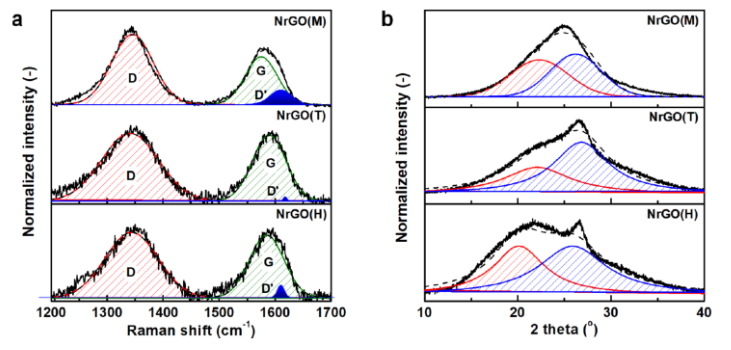 在這項研究中,我們深入表征了氮摻雜還原氧化石墨烯(NrGO)的結構,重點關注碳缺陷以闡明其導電性。為此,我們特意選擇了三種不同的NrGO材料,它們通過不同的代表性合成方法制備,即水熱法、高溫輔助法和溫和反應法。正如X射線光電子能譜所證實的那樣,所有材料在氧和氮方面都具有不同的官能團分布。有趣的是,紅外光譜表明這些材料表現出與氧和氮官能團相關的相似碳缺陷分布,盡管缺陷濃度不同。NrGO材料在石墨sp
