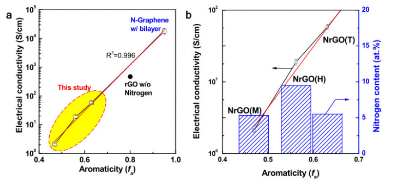 圖 5. NrGO 材料的電導率。(a) 作為芳香性函數的電導率的對數。(b)作為芳香性函數的NrGO材料的電導率和氮含量。