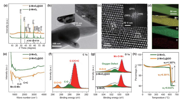 2@ GO的透射電鏡、HRTEM形貌和相關(guān)EDS圖(b和c中的插入物分別顯示了GO層的存在和衍射圖)。e β- MnO