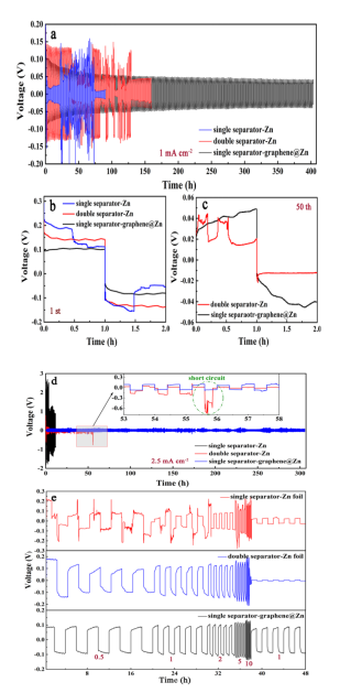 圖2. 石墨烯@Zn和Zn對(duì)稱電池的電化學(xué)行為:(a)1 mA cm