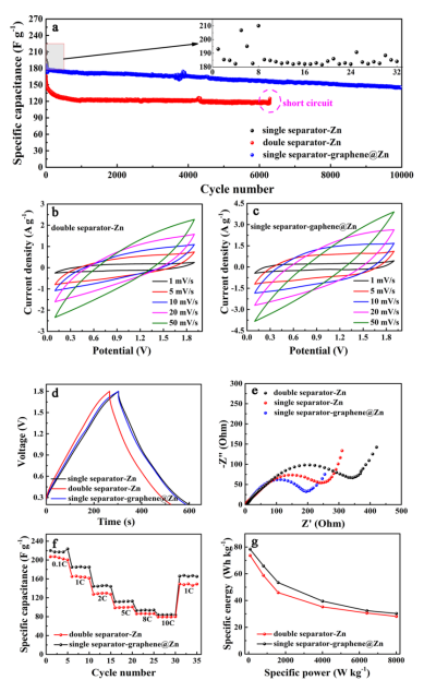 相關(guān)研究成果由佛山大學(xué)材料科學(xué)與氫能學(xué)院,廣東省氫能技術(shù)重點(diǎn)實(shí)驗(yàn)室Xinren Zhang等人于2021年發(fā)表在Journal of Energy Storage (https://doi.org/10.1016/j.est.2021.103037)上。原文:Graphene as regulating zinc deposition layer for long-life zinc ion hybrid supercapacitors。
