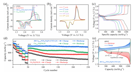 3N @N-CNT-G正極的充放電;(d)所有材料在不同C倍率下的容量和0.2C下的循環(huán)穩(wěn)定性,以及(e)3D