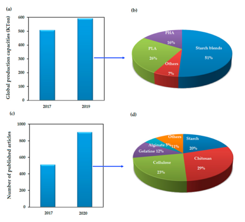 圖1. (a) 生物聚合物的商業(yè)生產(chǎn);(b) 2019年生物聚合物的商業(yè)化生產(chǎn);(c) 對用于食品包裝的不同生物聚合物進行的研究;(d) 2020 年對各種生物聚合物所做的研究。