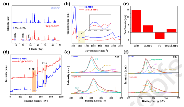 2和TC@Ch-MFO的Zeta電位。(d) Ch-MFO和TC@ Ch-MFO的XPS測量。(e) Ch-MFO和TC@ Ch-MFO的C 1s和(f) O 1s高分辨率XPS譜,并擬合曲線。