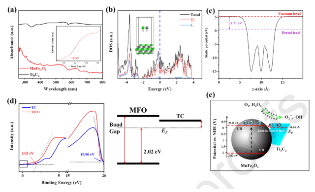4的UPS光譜的低和高動能區(qū)。(e)內(nèi)置電場誘導(dǎo)的Schottkyjunction增強TC@Ch-MFO的ROS生成活性機制。