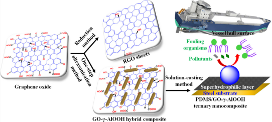 方案2. 通過還原法和一步超聲法與γ-AlOOH從GO制備RGO和GO-γ-AlOOH,分別用于船體的超疏水和FR涂層。