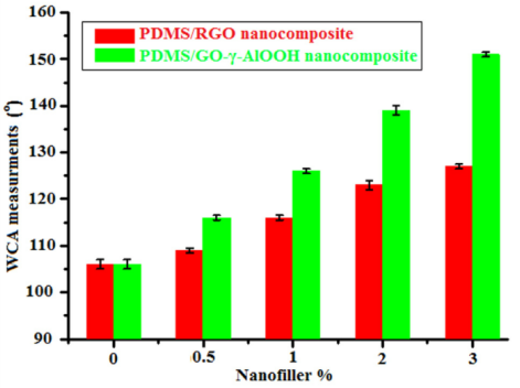 圖4. 未填充有機(jī)硅的基質(zhì)、PDMS/RGO和PDMS/GO-γ-AlOOH的WCA測定(三個重復(fù)的標(biāo)準(zhǔn)偏差由誤差線表示)。