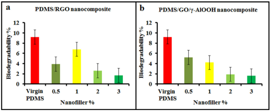 圖8. 在肉湯培養(yǎng)基中孵育30天,然后測試(a)PDMS/RGO和(b)PDMS/GO-γ-AlOOH納米復(fù)合涂層樣品在暴露于微生物環(huán)境中對抗多種細(xì)菌、酵母菌和真菌菌株后的生物降解性百分比。