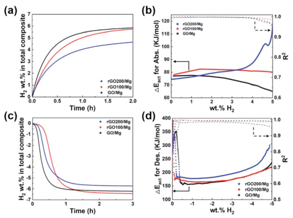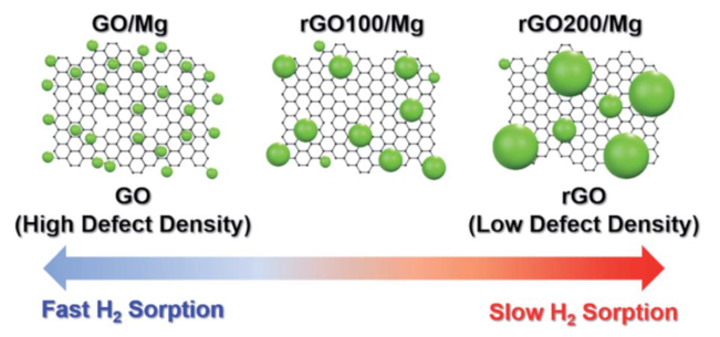 鎂的儲(chǔ)氫性能很大程度上取決于鎂粒子的大小和形貌,而這些大小和形貌決定了氫原子的擴(kuò)散路徑。雖然Mg/石墨烯衍生物復(fù)合材料作為儲(chǔ)氫材料的研究已經(jīng)深入,但對(duì)其與石墨烯衍生物的相互作用和Mg的形態(tài)演變的基本認(rèn)識(shí)尚待闡明,最終實(shí)現(xiàn)其儲(chǔ)氫性能的調(diào)整。在這里,我們揭示了石墨烯缺陷在Mg的尺寸和形貌中的作用,并通過(guò)使用不同還原程度的石墨烯氧化物(GO)來(lái)控制Mg的均勻性。與缺陷石墨烯氧化物(rGO)相比,被更多還原石墨烯氧化物(rGO)約束的Mg納米晶體不僅具有更高的脫/吸附活化能壘,而且誘導(dǎo)時(shí)間也更長(zhǎng)。Ab,initio計(jì)算表明,Mg和GO缺陷之間的相互作用主導(dǎo)了Mg化學(xué)勢(shì),抑制了小Mg納米晶體的生長(zhǎng)。
