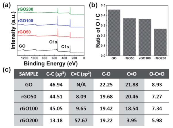 圖2 (a)制備的氧化石墨烯 (黑色)、rGO50 (紅色)、rGO100 (藍(lán)色)和rGO200 (綠色)的x射線光電子能譜,(b)氧/碳(O/C)原子比的變化,以及(C)基于峰面積計(jì)算的一系列rGOs的功能性百分比。
