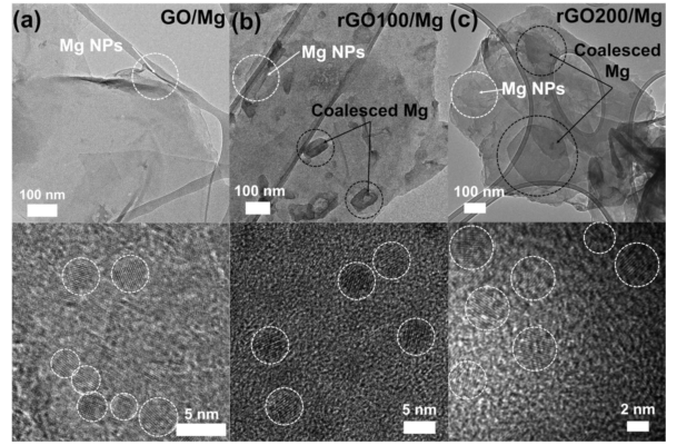 圖3 (a) GO/Mg, (b) rGO100/Mg, (c) rGO200/Mg納米復(fù)合材料的透射電鏡圖。