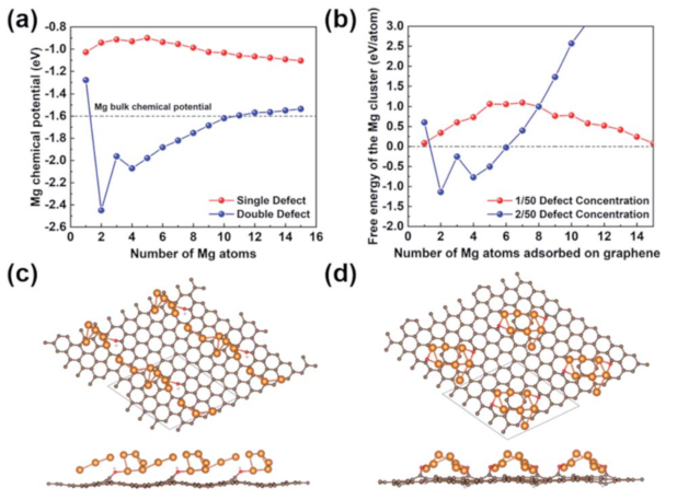 圖6 (a) Mg的化學(xué)勢(shì)根據(jù)兩種缺陷密度石墨烯上吸附Mg的數(shù)量而定。(b)在1/50和2/50缺陷密度下,固定Mg: C比的Mg團(tuán)簇的自由能。(c和d)在單缺陷(c)和雙缺陷(d)石墨烯上吸附Mg的最低能量構(gòu)型可達(dá)7 Mg。