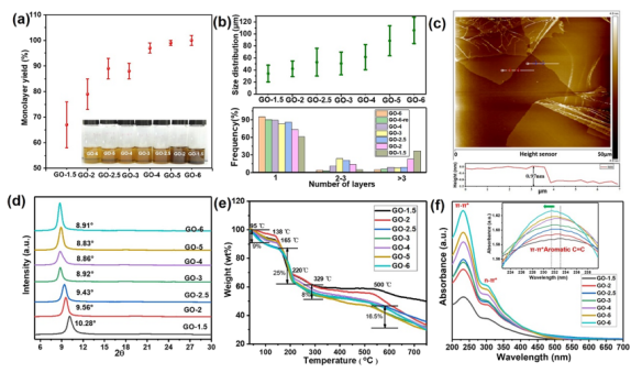 Figure 2. 不同高錳酸鉀/氧化石墨比例下制備GO產(chǎn)物的表征。(a)氧化石墨烯單層的產(chǎn)量。(b)相應(yīng)的片層尺寸和層數(shù)分布。(c)沉積在云母表面上GO-6的AFM圖像。(d)XRD圖譜。(e)凍干GO氣凝膠的TGA分析。(f)GO水分散體的UV-vis光譜。