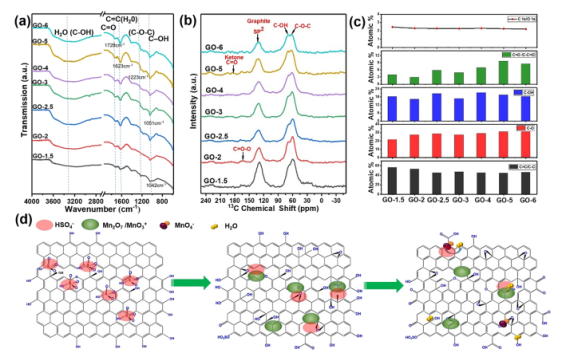 13C 固態(tài)核磁共振譜。(c) 基于XPS數(shù)據(jù),擬合估算碳官能團的含量。(d) 無水氧化工藝制備GO時,對應(yīng)的結(jié)構(gòu)轉(zhuǎn)變示意圖。