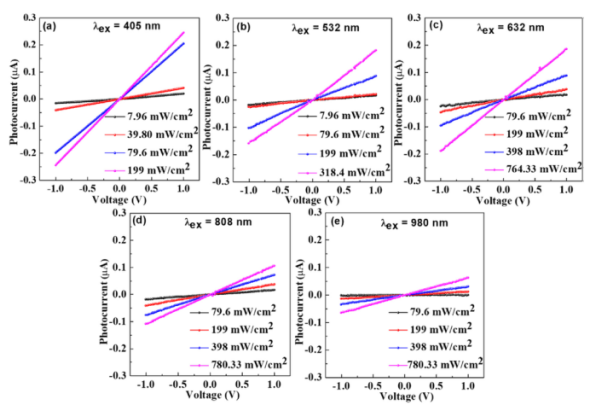 Figure 2. 基于EG/4H-SiC的器件在(a) 405、(b) 532、(c) 633、(d) 808和(e) 980 nm激光激發(fā)下,于不同功率密度下的絕對(duì)光電流對(duì)電壓特性,該數(shù)據(jù)從I-V曲線獲得。