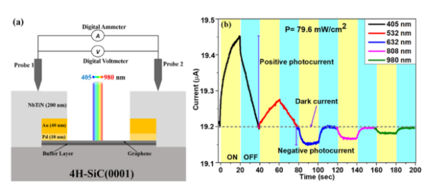 Figure 3.(a) EG/4H-SiC基裝置和雙探針光電探測(cè)器測(cè)量裝置(配帶有IBL)的示意圖。(b)基于EG/4H-SiC的裝置在1 V外加偏壓下(功率密度為7.96 mW/cm2)于不同波長(zhǎng)激發(fā)光下的動(dòng)態(tài)光響應(yīng)。