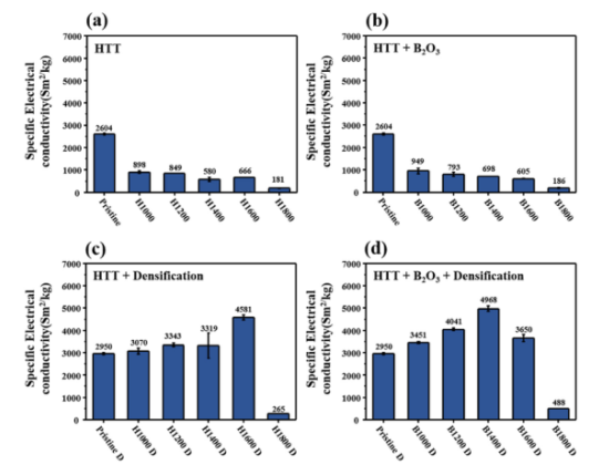 Figure 2. 不同類型碳納米管纖維的比電導率比較。(a)僅熱處理,(b)摻硼,(c)熱處理后致密化,(d)摻硼并致密化后的碳納米管纖維。