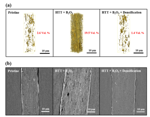 Figure 3.用x光顯微鏡對大尺寸內(nèi)部空隙進行無損成像。(a)通過三維重建圖像進行內(nèi)部空隙分布分析(尺寸10x10x40 mm)。熱處理溫度(HTT)為1200℃。(b)碳納米管的縱剖面2D圖像。
