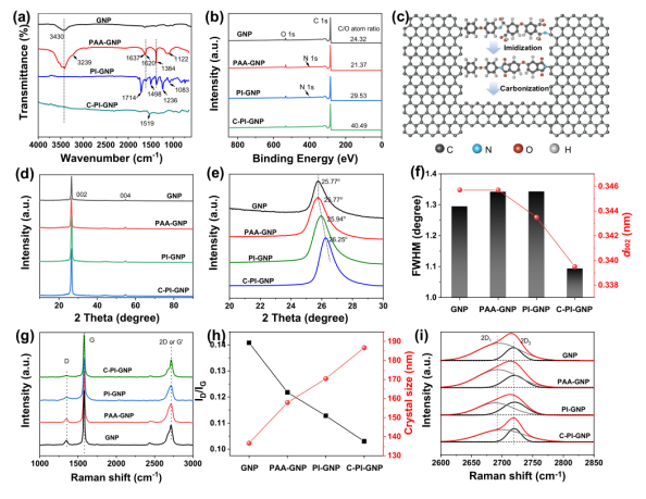 圖2. GNP、PAA-GNP、PI-GNP和C-PI-GNP骨架的(a)FTIR和(b)XPS光譜;(c)亞胺化和碳化過(guò)程中分子結(jié)構(gòu)演變的示意圖;GNP、PAA-GNP、PI-GNP和C-PI-GNP骨架的(d)XRD和WAXD(e)模式、(f)相應(yīng)的半最大值全寬(FWHM)和(0 0 2)d間距;(g)拉曼光譜;(h)I