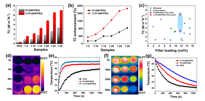 圖3. (a)PI-GNP/PEG和C-PI-GNP/PEG的熱導(dǎo)率和(b)TC增強(qiáng);(c)導(dǎo)熱系數(shù)與報(bào)告材料的比較;在加熱和冷卻狀態(tài)時(shí)的PEG、PI-GNP/PEG和C-PI-GNP/PEG復(fù)合材料的(d、f)紅外熱圖像和(e,g)相應(yīng)的表面溫度變化。