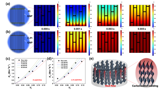 圖4. (a)PI-GNP/PEG和(b)C-PI-GNP/PEG骨架中熱傳導(dǎo)過(guò)程的有限元數(shù)值模擬?;冢╟)PI-GNP/PEG和(d)c-PI-GNP/PEG復(fù)合材料的實(shí)驗(yàn)數(shù)據(jù),建立具有不同指前因子的模型擬合曲線;(e)C-PI-GNP骨架中熱傳導(dǎo)機(jī)制的示意圖。