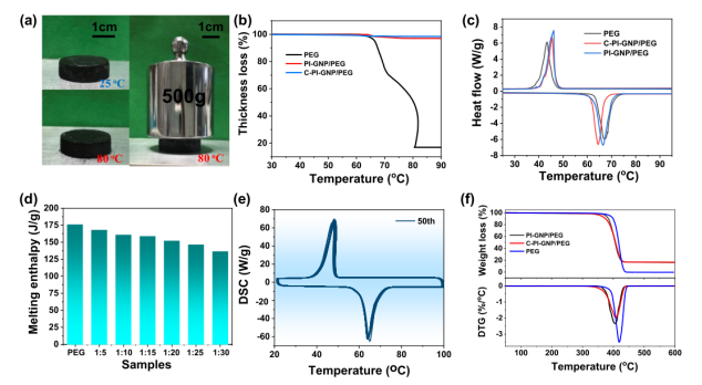 圖5. (a) C-PI-GNP/PEG復(fù)合材料在不同條件的熱臺(tái)上的數(shù)碼照片;(b) 在恒定壓縮載荷(4 N)下厚度隨溫度的變化;(c)PEG、PI-GNP/PEG和C-PI-GNP/PEG復(fù)合材料的DSC曲線;(d)不同C-PI-GNP/PEG樣品熔融焓的比較;(e)C-PI-GNP/PEG 1–20樣品的循環(huán)DSC曲線;(f)PEG、PI-GNP/PEG、C-PI-GNP/PEG復(fù)合材料的熱穩(wěn)定性。