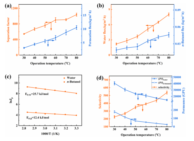 圖8進(jìn)料溫度對:(a)總通量和分離因子,(b)正丁醇和水通量,(c)正丁醇和水的阿倫尼烏斯圖,(d) Go - PA50 - Fe