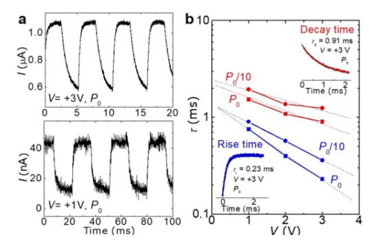 圖4. 鐵電半導(dǎo)體結(jié)的光響應(yīng)。(a)、(b)不同功率P