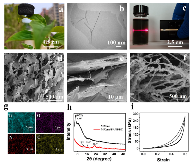 圖2 (a) MXene/PANI/BC氣凝膠質(zhì)量輕。(b)單層MXene的TEM圖像。(c)少層/單層MXene溶液產(chǎn)生的廷德爾效應。(d-f)不同分辨率下MXene/PANI/BC氣凝膠的SEM圖像。(g) MXene/ PANI/BC氣凝膠的EDS圖像。(h) MXene和MXene/PANI/BC氣凝膠的XRD譜圖。(i) MXene/PANI/ BC氣凝膠連續(xù)五次壓縮試驗。