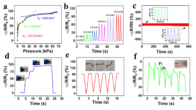 圖3 (a)相對電阻在壓力0 ~ 70 kPa范圍內(nèi)的變化。(b)加載卸載循環(huán)下不同壓力的重復傳感響應。(c) 68.18 kPa壓力下的騎行耐久性。(d)手指彎曲傳感器的傳感響應。插圖:安裝在不同彎曲角度的手指上的傳感器的光學圖像。(e)監(jiān)測手腕彎曲的傳感器響應傳感。插入:安裝在手腕上的傳感器的光學圖像。(f)傳感器檢測手腕脈沖的傳感響應。插入:安裝在手腕上的傳感器的光學圖像。