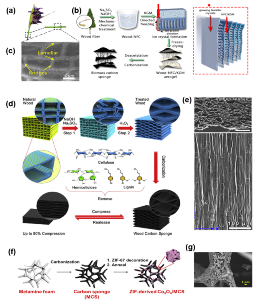 圖5. 水竹芋莖的a)數(shù)碼照片和c)SEM圖像。b)BCS設(shè)計(jì)和制造過程的示意圖。d)WCS的設(shè)計(jì)和制造過程圖解。e)碳海綿的SEM圖像。f)制作過程圖。g)Co