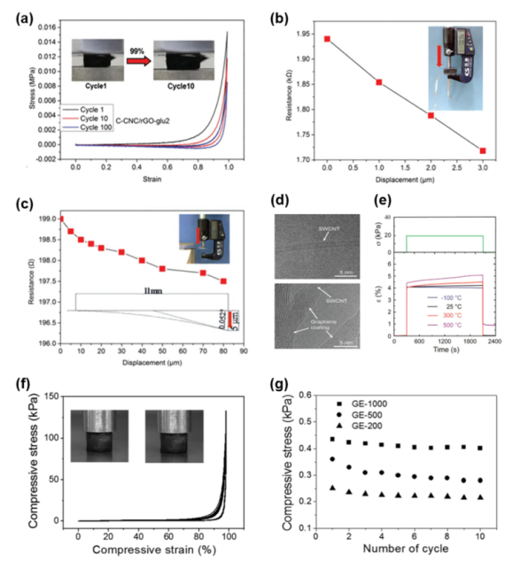 °)。d)單壁碳納米管壁(SWCNT)的透射電子顯微鏡(TEM)圖像;e)在T=−100、+25、300和500°時(shí)石墨烯包覆的單壁碳納米管氣凝膠的蠕變曲線。f)GE-1000的應(yīng)力-應(yīng)變曲線。g)退火的石墨烯彈性體的壓縮強(qiáng)度。