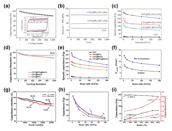 -1時(shí)1000次充電和放電循環(huán)后,電容保持率>80%。b)ε=50%,1000次循環(huán),在CNT和CNT PPy海綿中的記錄應(yīng)力值。c)不同海綿在不同掃描速率下的比電容。d)循環(huán)測(cè)試顯示CNT@PPy@MnO