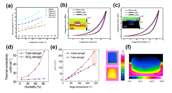 圖11. a)在不同w-CNT負(fù)載水平、不同壓縮應(yīng)變時(shí)w-CNT/PDMS的K。w-CNT/PDMS復(fù)合材料在b)120℃和c)−40℃的循環(huán)壓縮應(yīng)力-應(yīng)變曲線。d)室溫下CTA-25和二氧化硅氣凝膠的導(dǎo)熱系數(shù)隨濕度的變化。e)殼層厚度為25 nm的電纜氣凝膠和管狀氣凝膠的隔熱性能。f)直徑為4 cm、高度為2 cm的圓柱形CTA放置在表面溫度保持在400℃左右的熱板上的熱像圖。