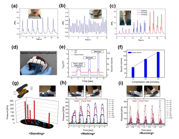 圖12. a-c)在檢測(cè)生物信號(hào)方面的應(yīng)用:手腕脈搏、吞咽、行走、跑步和跳躍。d)在柔性鋼琴墊中的應(yīng)用。e,f)以不同速度按下鍵盤時(shí)產(chǎn)生的音量。g)彈性鞋墊使用海綿,站立時(shí)的足底壓力分布。h,i)步行和跑步過程中應(yīng)力的動(dòng)態(tài)變化。