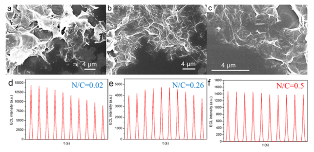 Figure 3.NCM在不同N/C比(摩爾比)時的SEM圖像,及PNC/NCM對應(yīng)的ECL響應(yīng)。(a-c) SEM圖像和(d - f) 在含有10 mM TPrA的乙腈中的ECL響應(yīng)。