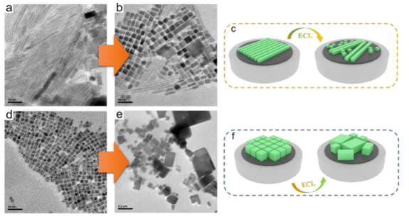 3納米立方體/NCM 在ECL反應(yīng)前后的形貌變化的TEM圖像。(c, f)ECL反應(yīng)前后的形態(tài)變化示意圖。