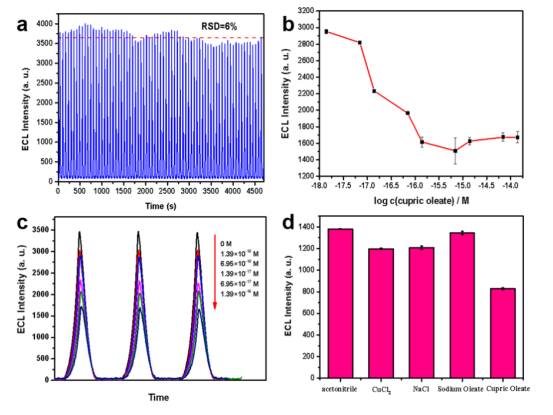 3 PNCs三相界面在含10 mM TPrA的乙腈中,表現(xiàn)出強烈的ECL強度,并在連續(xù)循環(huán)電位掃描超過1 h后仍保持穩(wěn)定。最后,將該方法應(yīng)用于油酸銅的檢測,檢出限可低至10