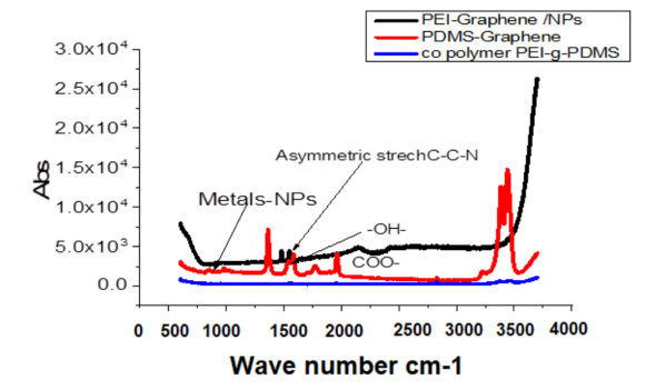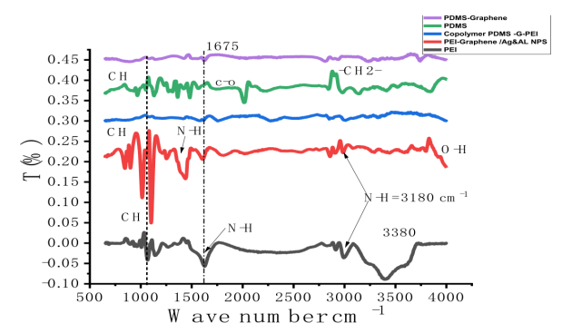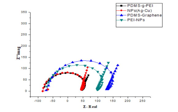 我們的工作旨在制造一種獨特的聚合物,用作導(dǎo)電和柔性芯片天線。它兼具是堅韌性,剛性,可拉伸性和良好的導(dǎo)電性等性能。制備的復(fù)合材料由兩種共聚物—聚二甲基硅氧烷(PDMS)和聚乙烯亞胺(PEI)—組成,與納米金屬(銅,銀)和石墨烯納米粒子組裝成基質(zhì)。納米金屬填充層間空間,聚合物空隙增強交聯(lián)劑。石墨烯/金屬納米粒子有助于通過金屬鍵制備螯合物,將聚合物的電導(dǎo)率從1.87×10