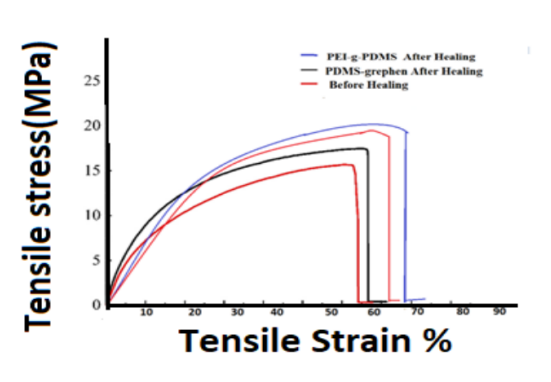 圖13. 研究了獨立的PDMS及其共聚物PDMS-石墨烯-PEI自我修復(fù)過程前后的應(yīng)力-應(yīng)變關(guān)系。