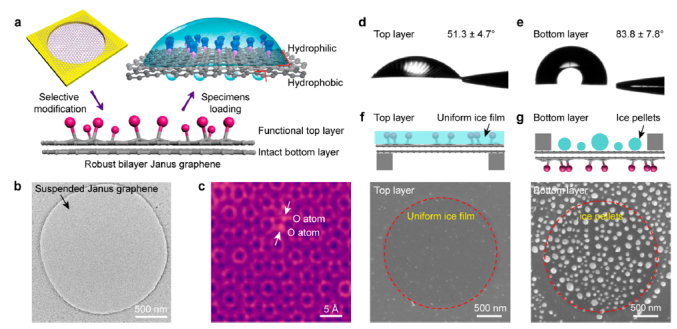 圖1 具有不對稱潤濕性的超凈雙層Janus石墨烯膜。(a)雙層Janus石墨烯膜示意圖。 (b)懸浮雙層Janus石墨烯的代表性TEM顯微圖 (c)雙分子層Janus石墨烯氧對構型的原子分辨率STEM圖像。(d, e)典型的光學圖像揭示Janus的親水表層石墨烯網格與水接觸角為51.3 (d)和疏水底層水接觸角為83.8 (e)。(f)均勻的冰膜表層的雙層Janus石墨烯示意圖。(g)雙層Janus石墨烯底層的非均勻冰珠示意圖。