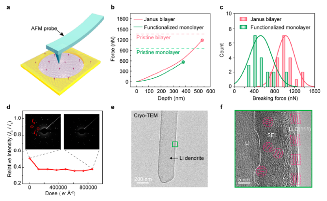 圖3 雙層Janus膜的機械穩(wěn)性能和電子束電阻。(a) AFM壓痕實驗示意圖。(b)雙層Janus和功能單層石墨烯的典型加載曲線。 (c)雙層Janus和功能單層石墨烯的斷裂力直方圖。(d)雙層Janus石墨烯在電子輻照下的穩(wěn)定性 (e)雙層Janus石墨烯上Li樹枝晶的低溫透射電鏡圖像。(f)面板e中顯示SEI與Li金屬界面的綠色區(qū)域的高分辨率圖像。