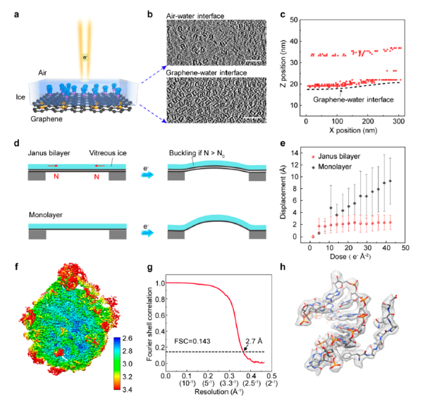 圖4 雙分子層Janus膜用于高分辨率低溫電鏡結構測定。(a)在石墨烯水界面吸附的生物大分子示意圖(藍色)。(b)蛋白酶體顆粒在空氣-水界面(上行)和石墨烯水界面(下行)的代表性冷凍電鏡切片。(c)玻璃化冰中20S蛋白酶體顆粒的空間分布。 (d)雙分子層Janus和單分子層石墨烯上冰膜的屈曲示意圖。 (e)電子束輻射下雙分子層Janus和單層石墨烯上的粒子運動。 (f)重建的50S核糖體的總密度 (g) 50S核糖體重建的傅立葉殼層相關(FSC)圖。 (h)選擇與相應原子模型對接的密度區(qū)域。