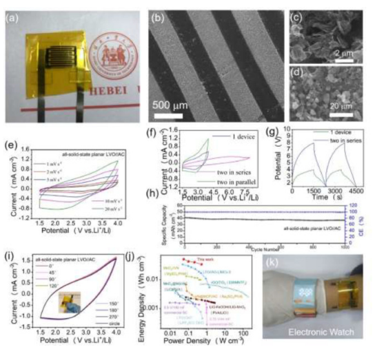 -1 時的循環(huán)性能和庫侖效率。(i)在不同彎曲角度下測量的LIMCs的CV曲線,插圖:LIMCs彎曲的照片;(j)Ragone曲線圖;(k)由兩個LIMCs串聯(lián)驅(qū)動的柔性數(shù)字手表的照片。